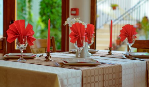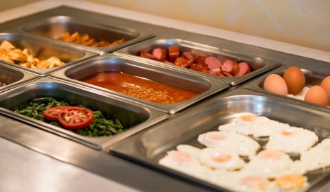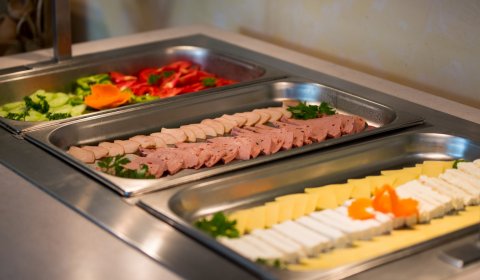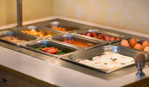 В летните месеци се предлага закуска на шведска маса. През останалото време можете да поръчате блюда по меню от национална или европейска кухня.